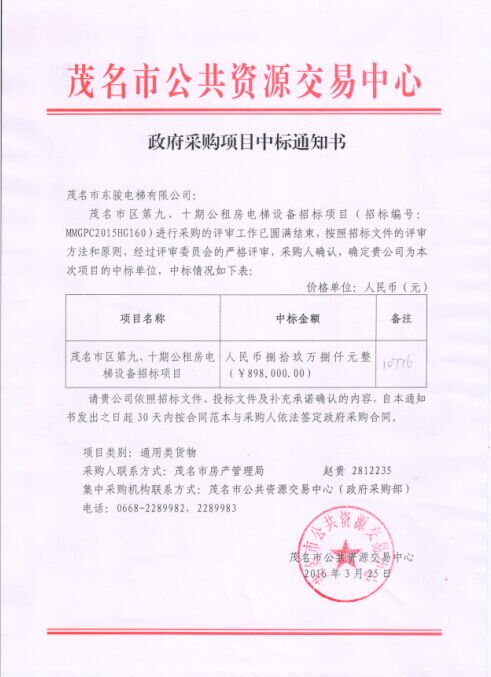 | 祝賀茂名市東駿電梯有限公司中標(biāo)茂名市區(qū)第九、十期公租房電梯設(shè)備招標(biāo)項目 |