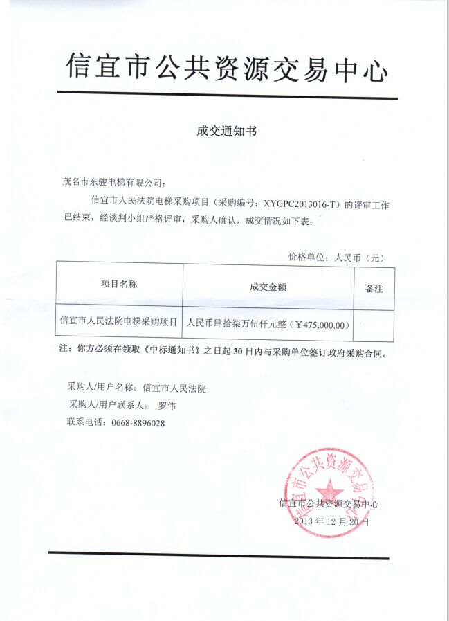 | 祝賀茂名市東駿電梯有限公司中標信宜市人民法院電梯設(shè)備采購招標項目 |