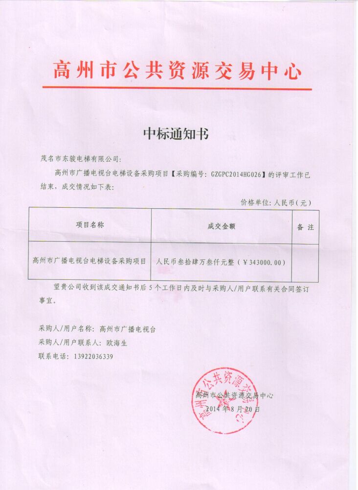 | 祝賀茂名市東駿電梯有限公司中標高州市廣播電視臺電梯設(shè)備采購招標項目 |